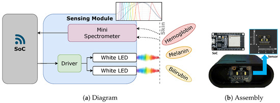 A System-on-Chip (SoC) enables the control of the sensor through a short-range wireless network. While two white LEDs generate the light stimulus in the VIS range, the sensor AS7341 captures the reflected data samples every 2 s with an integration time of 0.5 s. This sampling value is related to the bilirubin dynamic being relatively slow, with perceptive changes in an hour time base. Besides that, being a handheld or wearable device, it is susceptible to loss of signal situations related to body movements, which means a poor optical coupling between the sensor and the skin. Therefore, to guarantee valid measurements, it is necessary to evaluate the quality of the signal as a first step analysis and then proceed with the chromophores concentration evaluation more in deep. From a mechanical perspective, the sensor stands off 10 mm from the skin and the intensities or gain are adjusted by Inter-Integrated Circuit (I2C). The diagram of the developed prototype is presented in Figure 2a and the prototype used to perform the measurements of this work can be viewed in Figure 2b.