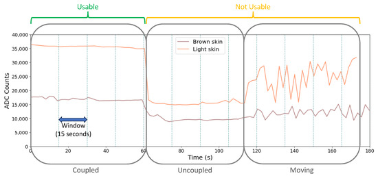 The acquired measurements were automatically windowed and manually labeled, based on the presented protocol and on the measurement signal characteristics. Two broader quality categories were defined: usable (high probability of having significant information) and not usable (low probability of having meaningful information due to artifacts or invalid samples). In the usable category, only one target is considered according to the device position: well coupled to the skin. Inside the not usable category, two possibilities were identified: uncoupled and moving.