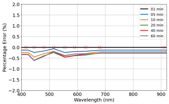 The light source spectrum characteristics were evaluated directly with the AS7341 and it reading stability was evaluated along 60 min. Basically, the prototype was placed over a white paper sheet, assuming this scenario as the maximum measured reflectance. Figure 5 shows this light source spectrum pattern acquired over time, while the measurement error, relative to the acquisition made on the first minute, is depicted in Figure 6. Markers represent the center of the micro-spectrometer channels in both figures. A peak at 450 nm and a more spread signal around the maximum level at 550 nm represent the spectrum characteristics of white LEDs. Regarding stability, the measurements revealed errors below 1% over all testing time, or below 0.5% considering a time period below 5 min.