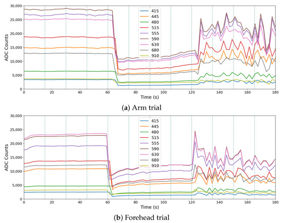 A full trial measurement, with nine spectral channels, is shown in Figure 7a, from the arm, and in Figure 7b, from the forehead. They follow the suggested measurement protocol of Table 1: coupled, uncoupled and moving. In windows in which intermediate conditions occur due to transitions, the chosen label was moving. Although the different moments of the presented trials can be visually detected, it is necessary to remember that the skin tones are diverse and simple metrics evaluation can lead to mismatches in the classification process. The same mismatches can occur between measurements on different body places, as can be seen when comparing Figure 7a and Figure 7b. From that, it is possible to perceive that the relation among the channels 555, 590 and 630, for example, changes from the arm to the forehead. This happens due to small differences in the skin layer structure at those body places.
