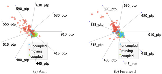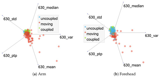 The outcomes from this analysis are based on Figure 8a,b, which represents the arm and forehead measurements, respectively. It can be perceived, in both cases, an overlapping of all scenarios, more visible in the coupled and uncoupled situations. Besides the visual evaluation, the ML model predictions were not satisfactory. Even being peak-to-peak, the indicated feature for this classification problem, other features alone were also verified, but scenarios overlapping were always present. This finding can be translated into the assumption that one metric alone is not sufficient to discriminate the target scenarios, even if it is considered over all measurement channels.