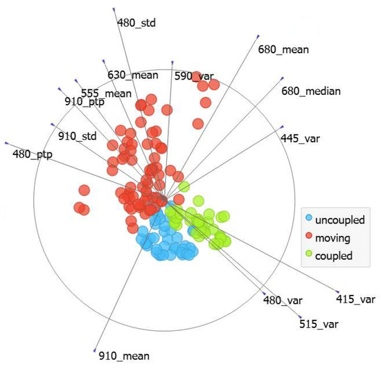 The last approach is, in fact, to use all the features. It is also important to remember that, for the final application of bilirubin measurement, all the channels will be needed to handle different skin tones. Therefore, the multivariate projection presented in Figure 10 illustrates that by using all the metrics and channels. Scenario segregation was possible in this case. This image shows linear projections with the features normalized and, although the features with longer base vector projections are more relevant for classification, all the features play a key role in the final classification capacity [32]. Inside the round circle are all the other features that contribute to this projection, but they are hidden to improve visualization. The use of all features was the selected approach for supplying the ML models that will be presented in the next section.