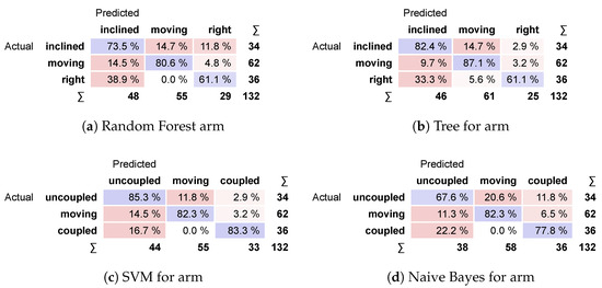The classification performance of the models can be compared for each target in the confusion matrix, as seen in Figure 11 for the arm. It integrates the prediction percentage for each target over their true values. Even with the Tree model reaching 87% of correct predictions for moving scenarios, it falls to 61.1% for coupled scenarios. The same occurs for other models except for SVM, from which the results are more stable and all scores are equal to or higher than 82.3%.