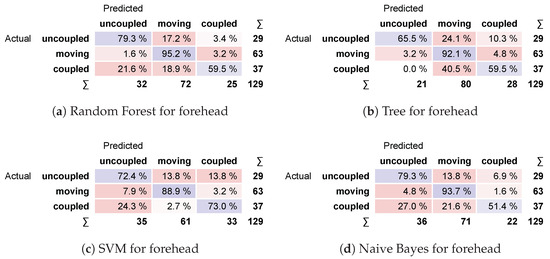 The confusion matrix for the forehead is shown in Figure 12. Most models present highly accurate predictions for moving scenarios, reaching values equal to or above 92.1%; however, the same models score below 60% for coupled scenarios. Again, the exception is the SVM model, which reaches 88.9% for moving, while keeping a score of 73% for coupled.