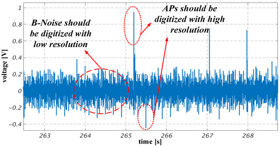 Figure 1 illustrates a neural signal recorded from a live rat’s brain. This signal was recorded by the Neurovision electrophysiological signal recorder of the Niktek Company in the Biomedical Integrated Systems Lab, University of Tehran [22]. During periods of neuronal inactivity, the recorded signal captures only the background noise (B-noise). In contrast, the excitation phase reveals prominent spikes known as action potentials (APs). In neuroscientific studies and neuro-prosthetic applications, APs convey essential information from cell to cell, and their sequences allow us to extract valuable insight into brain activities. While single-neuron firings encode neural information in the time domain, the amplitude of APs enhances spatial resolution and aids in distinguishing between APs originating from different neurons in high-density single-unit recordings.