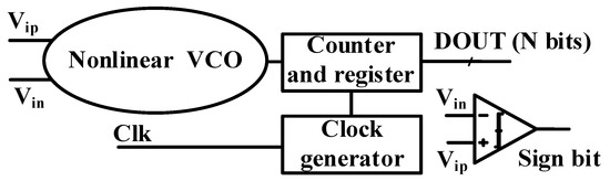 The proposed nonlinear VCO-based ADC is depicted in Figure 3. In contrast to conventional designs, the proposed architecture eliminates one VCO, as well as the counter/register and the subtractor components.