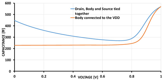 Capacitance of two PMOS transistors, the bulk of which are connected to source and drain (blue line) or VDD (orange line).