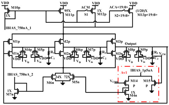 The dynamic comparator is represented in Figure 6. Due to the wide step around the zero point, the mismatch and offset of the comparator are negligible, and the sign detection comparator poses no serious challenges in circuit design. It should be noted that branches composed of a series of a high resistor and a capacitor (R1–R3, C1–C3) are employed at the output nodes of the delay cells of the VCO as low-pass filters to sense the DC voltages of the nodes. These DC voltages serve as input to the difference amplifier, Av1, setting the bias voltage of the output nodes of the delay cells of the VCO to VDD/2. By utilizing this functionality, the DC voltage of Av1 can be modified, thereby altering the nonlinear curve of the VCO-based ADC under consideration. This capability introduces reconfigurability to the ADC, enhancing its versatility and adaptability. MOS capacitors are sensitive to mismatches, process corners, and temperature variations. To mitigate mismatch issues, transistor sizes are chosen to be as large as possible. However, in VCO-based ADCs, the difference between the maximum and minimum frequency of the VCO must be greater than 2N times the sampling frequency to achieve the desired resolution, which is a bounding limit for enlarging the MOS capacitors. The mismatch variations could be compensated using an appropriate calibration scheme, as mentioned in Figure 5. Based on the Monte Carlo simulations, the current source/sink is identified as the most vulnerable part, particularly sensitive to mismatch. To keep these variations under control, the transistor M12p and the array of transistors M13p<19:0> are added and are used for calibration. Thus, the frequency variation can be reduced to less than half of the sampling frequency. These transistors can be turned on or off by switch S1 or the array of switches S2<19:0>. These switches are transmission gates constructed of PMOS and NMOS transistors in parallel. Based on Monte Carlo simulations in the simulation section, it was found that the main contributor to mismatch error is the current source/sink. The current sink has a variable component that adapts to the constant current source. Therefore, the calibration mechanism is applied to the current source. Variations in the current source or sink only affect the offset frequency of the VCO, and the frequency waveform is determined by MOS capacitors, whose mismatch can be considered negligible. Half of VDD is applied to all ADC inputs, and after sending the data to the output by toggling the switches (increasing and decreasing currents), the offset frequency is set to the same value for all ADCs. The sigma value of the ADCs, based on Monte Carlo simulations, is about 30 kHz, with an offset frequency of around 19.8 MHz. The current source value is 96X, which can be adjusted to 1/20 of X (by S2 switch arrays) for calibration purposes.