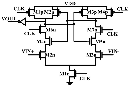 A dynamic comparator is used to detect the sign of the signal after the conversion process (Figure 6). Based on the application (neuro-prostheses), the data will be processed outside of the chip. Therefore, to simplify the digital design and minimize area and power consumption, we chose to detect the sign of the digital code by adding a leading sign bit. This approach allows for a more efficient implementation compared to other coding schemes, such as two’s complement, which would increase complexity without providing significant advantages for this specific use case. The proposed topology effectively eliminates B-noise. In contrast, the offset of the comparator has minimal impact on the ADC’s performance. Notably, the frequency variation of the VCO around the zero input is negligible, effectively removing the B-noise. Expanding the quantization level around the zero point can ease the design of the sign detection comparator against mismatches.