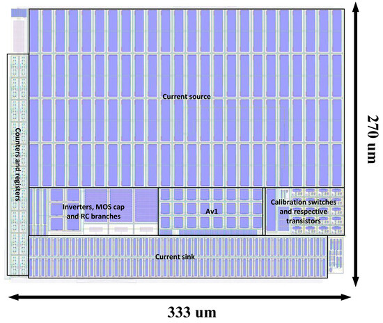The layout of the proposed VCO-based ADC was drawn in the TSMC 180 nm CMOS technology node is and reported in Figure 8. The primary components sensitive to process asymmetries are the current source and current sink. To mitigate these effects, we implemented a common centroid layout for these components, ensuring proper matching between the reference current and the output currents, which directly influence the VCO’s performance. As an example, in the current source, all transistors (e.g., X95) are symmetrically placed around the reference transistor of the current mirror to optimize matching. The corresponding components are labeled in the figure for clarity.