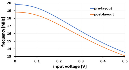 All parasitics were considered in the post-layout simulation. The layout was extracted using Calibre, and both resistive (R) and capacitive (C) parasitics were included in the simulations for the proposed architecture. Post-layout simulations were performed on the proposed nonlinear VCO-based ADC operating at 1 V supply voltage. The VCO’s output frequency ranges from 13.5 MHz to 19.82 MHz, corresponding to a differential input signal variation from −1 V to 1 V. Figure 9 illustrates the frequency variation for the differential voltage component Vdiff, where Vip = 0.5 + Vdiff and Vin = 0.5 − Vdiff. Since the ADC waveform is symmetric around the y-axis, the frequency variation is shown for Vdiff ranging from 0 V to 0.5 V. The orange (blue) waveform represents the pre(post)-layout simulation results. Both the curves meet the performance criteria of an 8-bit 16 kS/s ADC.