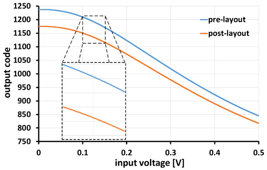Nonlinear VCO-based ADC transfer curve (the orange (blue) waveform represents the post (pre)-layout simulation results).