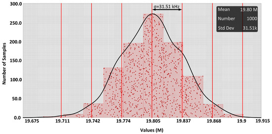 Monte Carlo simulation results considering mismatch models for all the components (mean = 19.80 MHz, standard deviation = 31.51 kHz).