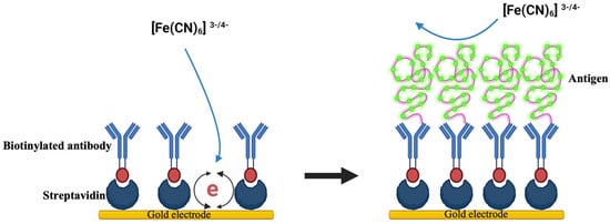 A schematic diagram illustrating a label-free immunobiosensor for detecting CTX-1, adapted and modified from reference [91].