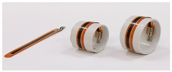 The flexible sensor presented in Section 2.1 is controlled by an ESP32 uC with a Bluetooth/Wi-Fi module, and the relative single supply electronic interface is fabricated on flexible printed circuit board (PCB) and powered by a Li-Po battery.