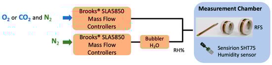 Calibration set-up: CO2 and O2 are fluxed via the mass flow controllers into the measurement chamber, where the RFS and the humidity sensor are placed.