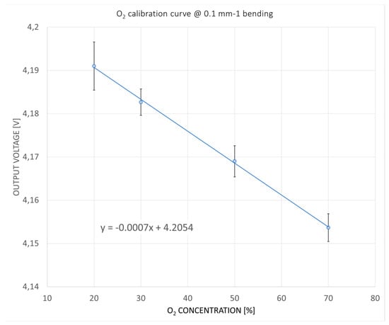 Three measurements were executed for each of the following concentration levels of O2: 20%, 30%, 50%, and 70%, as described in the methods section, for each of the three bending conditions selected: 0 mm−1, 0.05 mm−1, and 0.1 mm−1. The responses obtained for the first two configurations (0 mm−1 and 0.05 mm−1) were not significant: they were very low in magnitude and, in general, not sensitive to concentration changes, meaning that the modification of the output voltage of the sensors did not follow the concentration shift.