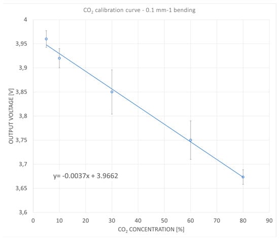 Three measurements were used for each of the following concentration levels of CO2: 4%, 10%, 30%, 60%, and 80%, as described in the methods section, for each of the three bending conditions selected: 0 mm−1, 0.05 mm−1, and 0.1 mm−1. As in the case of O2, the responses obtained for the first two configurations (0 mm−1 and 0.05 mm−1) are not significant: they were very low in magnitude and, in general, not sensitive to concentration changes, meaning that the modification of the output voltage of the sensors did not follow the concentration shift.