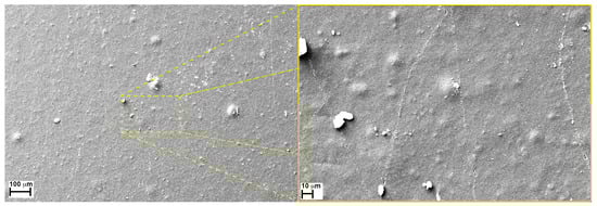 The first images, seen in Figure 7, display the surface of a new sensor at low and high magnification. Even though it is new, it is crossed by a high number of microcracks that, although organized randomly, seems to possess quite a repetitive pattern, at least considering their morphology. This suggests that the presence of these fissures is probably due to the fabrication method of the sensor; a hypothesis confirmed by the sensor’s technology mechanical application design guide [Ref to “the Bend Sensor® Technology Mechanical Application Design Guide” https://flexpoint.com/wp-content/uploads/2021/08/5ec652_ae5e028eb753496eb0608553a7deed1d, accessed on 4 September 2023] which confirms that these microcracks are introduced during processing into the carbon/polymer coating of the sensor. The presence of these microcracks results in their opening and closing upon bending, which enables a change in resistance with deflection and repeatability over the bending process range. In addition to that, the presence of these microcracks allows these sensors to possess better sensitivity in those applications where the presence of a specific environment (presence of high humidity, O2, nitrogen, or other gases) might change the device’s response. Which, effectively, most likely happens thanks to the interaction between the said environment and the cracks’ surfaces, where gases can find a larger surface area over which to deposit and react.