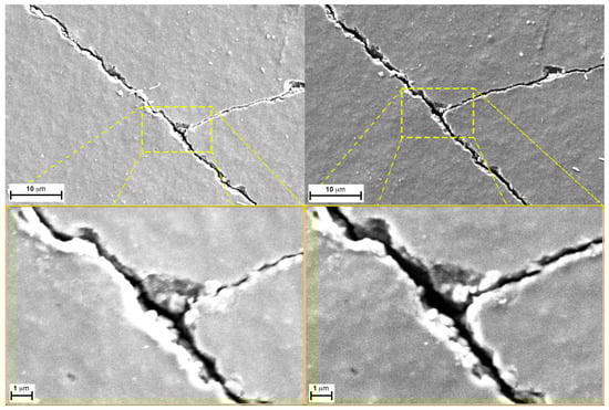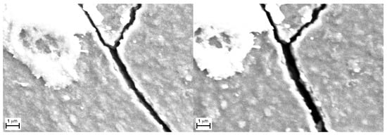 As demonstrated by the images in Figure 8, which compare the new sample to the one with the higher bend stress, even though the new sample’s surface is already cracked, the fissures enlarge upon the application of stress, and the distance between the two edges of the same crack almost doubles in size.