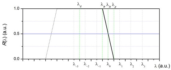 where (Figure 1) is the wavelength corresponding to the beginning of the inclined dependence, is the spectral width of the inclined section of the , is the proportionality coefficient (), is the resonant wavelength of the FBG, and is the wavelength corresponding to the end of the inclined section (). If the transmission spectrum width of the photodetector filter (or the spectrum width of the radiation source, if, for example, several semiconductor lasers are used) is significantly less than the value , then the dependence is actually the dependence of the power p of the radiation reflected by the FBG, normalized to the maximum value, on the wavelength .