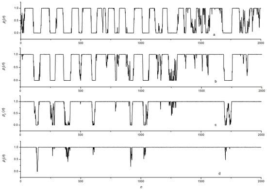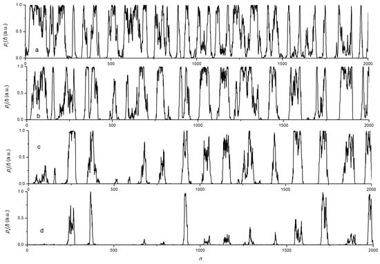 The simulation of was performed using recurrent formulas [] for a stationary sequence of numbers , where n is the number of the sequence element, with a normal distribution, unit variance, and exponential auto-correlation function C of the form: