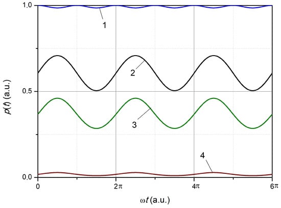 First, let us consider the case of a weak vibration (). An example of the calculated dependencies of at four characteristic points, at the top of the spectrum (at , i.e., at ), on the slope of the spectrum (, ), and in the region of small values of the reflected power (), is shown in Figure 5. It follows from the obtained dependencies that at the top of the spectrum the reflected signal (Figure 5, dependence 1) has a doubled frequency compared to the deformation frequency and a relatively small amplitude. The signals have a shape close to sinusoidal but different amplitudes (Figure 5, dependencies 2 and 3) on the slope of the spectral dependence at the point of maximum sensitivity () and slightly lower. The signal has a shape similar to the above dependencies but a significantly lower amplitude at . The phase of the reflected signal on a slope with coincides with the phase of strain oscillations, and on a slope with , it has the opposite phase.
