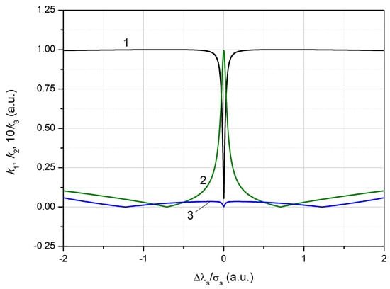 where is the proportionality coefficient, is the equivalent half–width of the reflection spectrum of the FBG [,], is the difference between the wavelengths of the radiation source and the resonant wavelength of the FBG at zero deformation (i.e., in the absence of stretching or compression). Let us further consider the normalized functions , i.e., assuming .