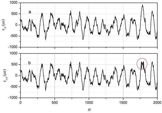 For the remaining wavelengths of , the value of was not calculated. Random noise in the amount of 1% of the maximum value was added to the signals of each channel. An example of the initial waveform of strain () of the FBG during vibration and the resulting waveform restoration () using eight wavelengths is shown in Figure 9. As follows from Figure 9, there was a good coincidence of the dependencies and . Note also that in the presented example, a fragment of the dependence was specially selected for which, in the range n from 1773 to 1793, the value of exceeded 750 , which made it impossible to accurately restore the signal in this n range. Therefore, if necessary, in similar cases, for example, to identify the maximum values of stretching or compression of the FBG during vibration, it is necessary to add another measurement channel at the wavelength of for which .