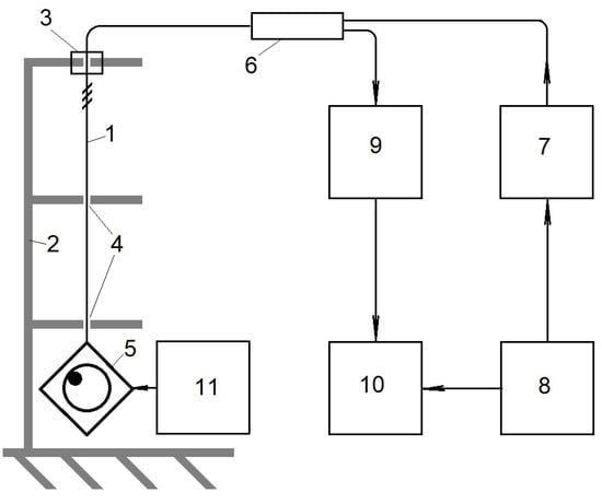 The scheme of the experimental installation: 1—optical fiber with FBG, 2—mechanical construction, 3—device fixing the optical fiber, 4—holes in the brackets, 5—electric motor with an eccentricity, 6—fiber optic splitter, 7—semiconductor laser with Peltier element, 8—laser temperature control unit, 9—photodetector module, 10—personal computer with ADC converter, 11—motor power supply.