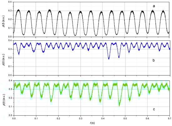 The dependencies obtained at different laser temperatures with a step of 0.1 °C were preserved. An example of the obtained dependencies of for a relatively small deformation is shown in Figure 11. Figure 11a corresponds to the case of the location of the working point near the sensitivity maximum, b—at the maximum, i.e., approximately at , c—near the maximum of the reflection spectrum of the FBG. The characteristic properties of the obtained dependencies corresponded to the results obtained by numerical simulation for harmonic oscillations (Figure 5). The dependence in Figure 11a had a shape close to sinusoidal with a period of approximately 46 ms, which corresponds to a frequency of 22 Hz. The dependence shown in Figure 11c was due to the fact that the resonant wavelength of the FBG, which varied with the vibration, reached the wavelength of radiation of the source and exceeded it for some time. This led to a noticeable appearance of the second harmonic of the vibration signal. Figure 11b corresponds to the case in which the signal had a doubled vibration frequency of approximately 44 Hz. The estimated value of the vibration magnitude, as shown in Figure 11a, was approximately . The spectral density of the signals shown in Figure 11 were calculated (Figure 12). It followed from the obtained dependencies (Figure 12) that in the first case (dependence a, Figure 11), the first harmonic of the signal was dominant. The maximum spectral density of the second () and third () harmonics was approximately 11 and 14 times less than the first (), respectively. In the second case (dependence b, Figure 11), the second harmonic dominated, in which and were 1.5 and 3 times smaller than . In the third case (dependence c, Figure 11), and were 2 and 16 times smaller than . That is, the experimental data obtained confirmed the identified characteristic features of the signals generated by the radiation reflected from the fiber Bragg grating during linear oscillations.
