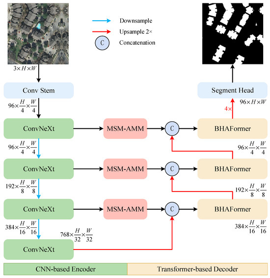 In the decoder stage, we use BHAFormer for post-processing to compute global information. The deep feature output from the encoder is used as the input to the BHAFormer in the decoder, and the global information is modeled using the high-level abstract feature processing capabilities of the two attention paths of the BHAFormer to capture more complex semantic features. BHAFormer contains significant attention path (SAP) and overall attention path (OAP), in which the size of the input feature map can be reduced to 1/4 of its original size and retained to contain significant features such as texture, edges, and corners, as well as overall features such as overall structure and background information, respectively, before SA computation. In this way, it is possible to realize global relationship modeling from different perspectives separately, while reducing the cost of SA computation by exploring global dependencies from more perspectives, which helps to extract the boundary of a building more accurately and locate the building as a whole in a variety of complex scenarios. In addition, by introducing MSM-AMM between the encoder and the decoder, the information loss caused by the downsampling process is mitigated, and the decoder is provided with the multiscale semantic information and channel representation of the encoder.