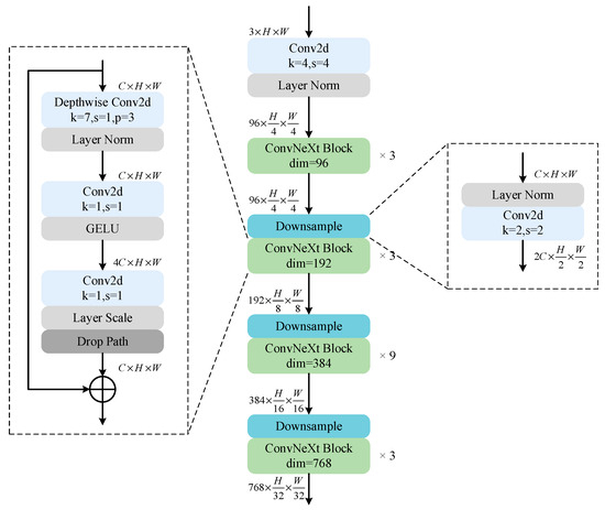 As shown in Figure 3, the ConvNeXt backbone network has a hierarchical structure divided into four stages, each consisting of multiple convolutional blocks (ConvNeXt blocks). Among them, the number of ConvNeXt block stacks in each stage is 3, 3, 9, and 3. At the entrance of the network, the image is first passed through a convolutional layer with a step size of 4 to fuse neighboring elements and reduce the image size. After that, before the beginning of each stage, downsampling is performed through a convolutional layer with a step size of 2 to extract features at different scales. With the design of a layered structure, ConvNeXt is able to better capture shallow features, such as the details and edges of buildings, as well as deeper features, such as the overall structure and layout.