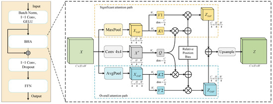 Previous work pointed out [36] that intensive pixel-level SA computation may not be required for the global relationship modeling of individual buildings in a local area. Therefore, it performs rough global relationship modeling by reducing the query, key, and value sequence lengths; however, this cannot be used to treat local details. To address these problems, we designed the BHAFormer. As shown in Figure 4, the BHAFormer block consists of a batch normalization layer, two 1 × 1 convolutional layers, a GELU activation layer, a dropout layer, bilateral hybrid attention (BHA), and a feed-forward network layer.