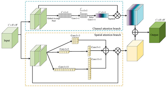 During the downsampling process of the encoder, the shallow features generated contain a wealth of fine-grained information, such as color, texture, edges, and corner points, which are important. However, as the network layers deepen, it inevitably leads to information loss and noise interference. To solve this problem, we design the multiscale mixed attention mechanism module (MSM-AMM), which is used to supplement the information loss in the downsampling process and enhance the network’s ability to recognize buildings. As shown in Figure 5, MSM-AMM contains two attention branches for enhancing the multiscale representation of encoder features in the spatial semantic and channel dimensions. In the spatial attention branch, we use a 3 × 3 convolution and two sets of strip convolutions (1 × 5 and 5 × 1, 1 × 11, and 11 × 1) to capture multiscale features. Strip convolutions are particularly suitable for extracting strips from segmented scenes [46]. In the channel attention branch, the feature map is compressed to 1 in length and width by global average pooling to efficiently aggregate the global spatial information of each channel so as to pay more attention to the representation of channel features. Next, we use two 1 × 1 convolutions to compress the number of channels to 1/r times the original and then recover them to learn the dependencies between channels, highlight important features, suppress unimportant features, and reduce the noise, where the compression ratio r is 16. Then, the channel attention map is obtained by a sigmoid function, which is used to further adjust the importance weights of each channel. Finally, the outputs of the two branches are multiplied by the original inputs to learn a multiscale representation of the space and channel dimensions, which are then added together to fuse the features.
