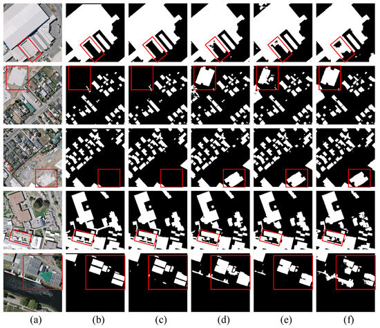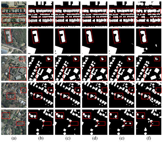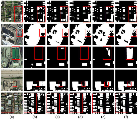 Subsequently, we added BHAFormer and MSM-AMM to the benchmark model, and the results showed that the F1-score, IoU, and precision were 90.52%, 82.68%, and 91.75%, respectively, for the best performance. Compared to the benchmark model, the three evaluation metrics improved by 0.71%, 1.17%, and 0.58%, respectively. These results show that the comprehensive performance of the model is significantly improved by combining BHAFormer and MSM-AMM, which further proves that each of our proposed modules helps the model in building extraction. As shown in the visualization results in Figure 6, before the introduction of BHAFormer and MSM-AMM, the segmentation results of the baseline model showed more mispredictions by predicting the background as buildings, while the edges of the closely spaced small buildings were lost, resulting in the display of a blurred whole in the prediction result map. When BHAFormer and MSM-AMM are added, the mispredictions of buildings are reduced, edges are smoother, and the gaps between buildings in a dense cluster of small buildings are more clearly visible. This illustrates that the global relationship modeling capability of BHAFormer helps the model to accurately locate buildings in complex background environments and reduces false predictions. Meanwhile, the multiscale features captured by MSM-AMM enable the model to extract small buildings more accurately and suppress the interference of background noise on building edge extraction.