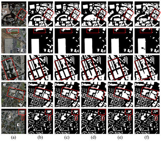 Visualizing ablation study results on the Inria aerial image labeling dataset. (a) Images. (b) Labels. (c) CTANet. (d) Only BHAFormer. (e) Only MSM-AMM. (f) Baseline.