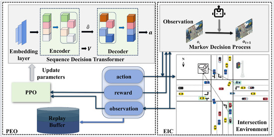 As shown in Figure 1, the entire framework of SDT is depicted. It utilizes a transformer neural network architecture that includes an encoder and a decoder, forming an actor–critic structure. The encoder is tasked with receiving observations, learning the representations of these observations, and inputting the encoded observations into the decoder. As part of its role as a value network, the encoder also outputs the value of the received observations, which is utilized for the subsequent update of its parameters. The decoder, working as the policy network, is responsible for receiving the encoded data from the dncoder and outputting the action that the agent is required to execute. In addition, PPO is responsible for updating the parameters of the policy network using data from historical trajectories, enabling the ATSC agent to make better decisions.