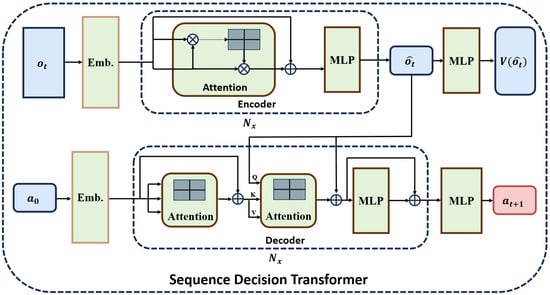 Figure 2 depicts the conceptual structure of SDT, which is mainly comprised of two components: the encoder and the decoder. The encoder is responsible for receiving observations from the environment, learning representations of observations , and outputting the value of the received observations at time t. The decoder is in charge of outputting the action to be executed by the agent at time t. Consequently, after the agent performs a predetermined number of steps, a portion of the historical trajectory will be given to PPO for updating the policy and the encoder–decoder networks.