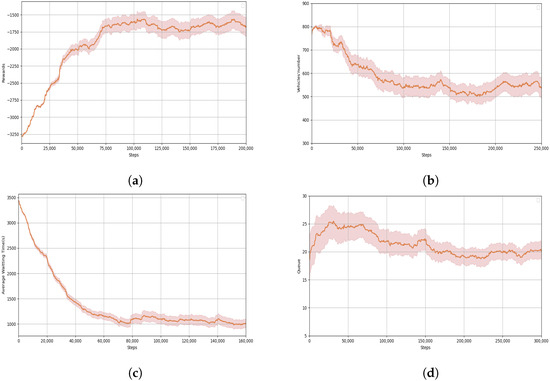 Performance of SDT during the training process. (a) Rewards curve with time steps. (b) Number of vehicles in the intersection over time. (c) Average waiting time for the intersection over time. (d) Queue length of the intersection over time.