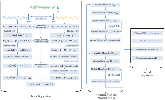 Figure 1 illustrates the overall framework of NDPCS-KS. First, the two communication nodes generate an initial key through the initial negotiation process. Specifically, both parties probe their CSI via the main channel. After quantization, the data are divided into groups, and the grouped quantized information is encoded using Hamming codes and then hashed. The hashed Hamming-encoded information is exchanged over the main channel, and both parties locally compare the results. If discrepancies are detected, indicating an error, error correction is performed by flipping the erroneous bits based on the parity check matrix calculated from the Hamming codes. Through this process, all groups undergo verification and error correction, ensuring that both parties ultimately generate the same initial key seed.