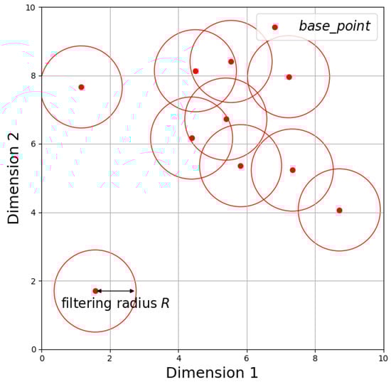 After obtaining the density of each , the initial radius R is dynamically adjusted to a new filtering radius . Specifically, suppose the density at a exceeds a preset threshold . In that case, the filtering radius at that is reduced to minimize the impact of overly concentrated . Conversely, if the density is below a lower threshold , the filtering radius is increased to capture more potentially relevant . By dynamically adjusting the filtering radius based on the density of around the , the radius is decreased for high-density points and increased for low-density points, making the filtering process more random. Let be the high threshold, be the low threshold, and be the adjustment value; then, the calculation of is as follows: