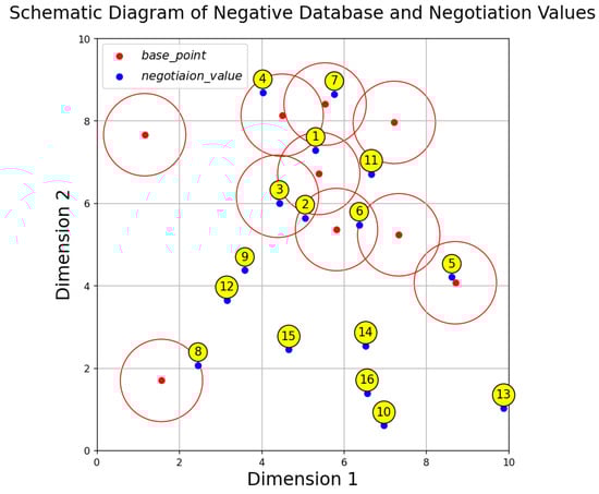Finally, the communication key is generated through the second negotiation process. First, the density of the around each is calculated, and based on this density, the radius R is dynamically increased or decreased to obtain a new radius , making the final filtering more random. After dynamically adjusting the radius, each in the is used for filtering in the NDB. Specifically, if a falls within the circle defined by the radius around a , the corresponding key position is set to 1. Conversely, if a does not fall within any circle, the corresponding key position is set to 0. This process results in a communication key with the same length as the .