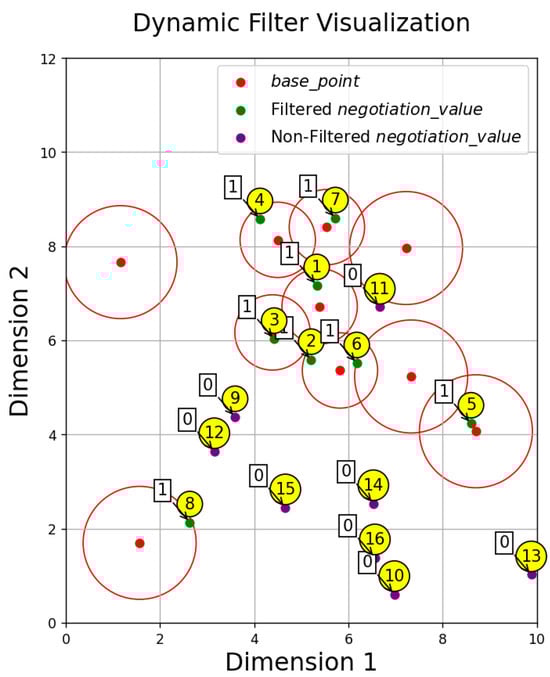 Thus, by filtering the through a second negotiation using the NDB, a 128-bit key sequence is obtained. This communication key sequence can be directly used for encryption and decryption with the length of the communication key being dynamically adjustable. The schematic diagram of the second negotiation process for generating the communication key is shown in Figure 4. In the figure, purple dots represent unfiltered , red dots represent , green dots represent filtered , and red circles represent the dynamic radii corresponding to the . The radii vary for different due to dynamic radius adjustment based on the density of the near each . The covered by the red circles are filtered. The numbers in yellow circles indicate the identification numbers of the , while the numbers in the squares represent the assignments in the filtered key sequence after filtering. For example, the communication key sequence filtered out in Figure 4 is 1111111100000000. Note that this example is for illustrative purposes, and the actual communication key generation is random.