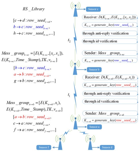 Equation (10) indicates that sensor b is the parent of sensor a, and sensors d and f are the children of sensor a (that is, the child node is on the left side of → and the parent node is on the right side of →). This identification reflects the relationship between connected nodes. After the initial negotiation, each sensor establishes its local , which is then used for subsequent key synchronization.