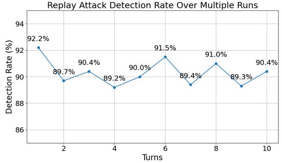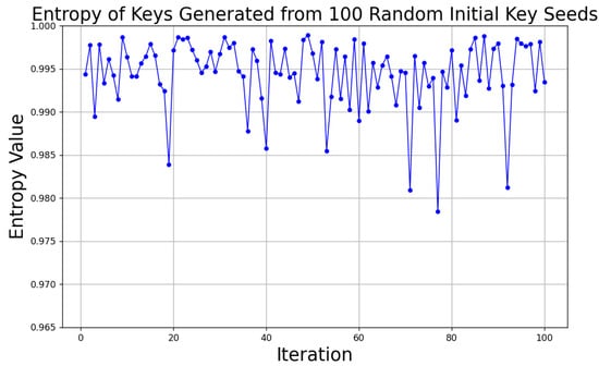 The closer the results are to the theoretical maximum value (1 for binary keys), the more it indicates that each bit of the key is nearly equally likely to be 0 or 1, ensuring satisfactory randomness and security. The key generation process is repeated 100 times, and the results are shown in Figure 14: the entropy values of the keys generated by NDPCS-KS all approach 1, indicating that the keys have excellent randomness and a high degree of uncertainty. Such keys are difficult to predict, therefore enhancing their security.