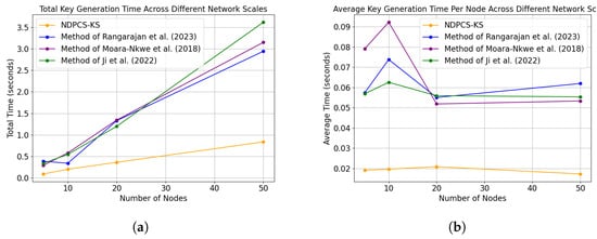 Due to experimental limitations, a simulation-based approach on a computer was adopted to compare the performance overhead of various methods under different network scales. Figure 11 presents the total time overhead for key generation and the average time overhead per node for key generation under different network scales for the methods referenced in [,,] as well as NDPCS-KS.
