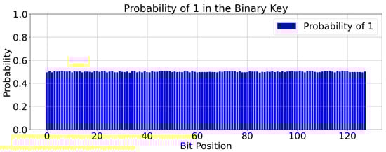 A secure key generation method is expected to exhibit randomness and unpredictability, meaning the probability of each bit of the generated key being 0 or 1 should approach 50%. The experiment uses a common pseudorandom number generator to simulate the generation of CSI and obtains the initial key seeds. Subsequently, the key generation is repeated 10,000 times, and the number of times each key bit appears as 1, where i is a positive integer representing the key bit positions from 1 to 128, is recorded. The probability of generating a “1” for key bit i can then be calculated as follows: