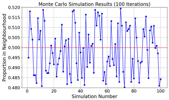 Therefore, the Monte Carlo method is utilized to estimate the probability that a random point falls within the neighborhood of at least one by generating many random samples. We calculate the probability that a random point, uniformly distributed in the range [0, 10] × [0, 10], falls within the neighborhood () of at least one of 25 also defined within the same range. The specific simulation steps are as follows: