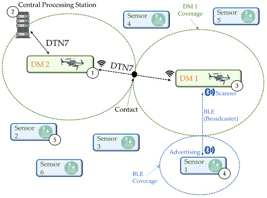 Figure 1 illustrates the proposed architecture. DM1 (3) is a mobile microcontroller device that can be attached to a vehicle, manned or unmanned, depending on the application, with each DM responsible for a sub-network. A sub-network consists of DMs and static SN, such as (4, 5). DM1 follows a movement routine to capture information from SNs as they enter their communication range. The data from SNs are transmitted and stored in DM1, then forwarded to other DM nodes (1) until they are offloaded at a central processing station (2).